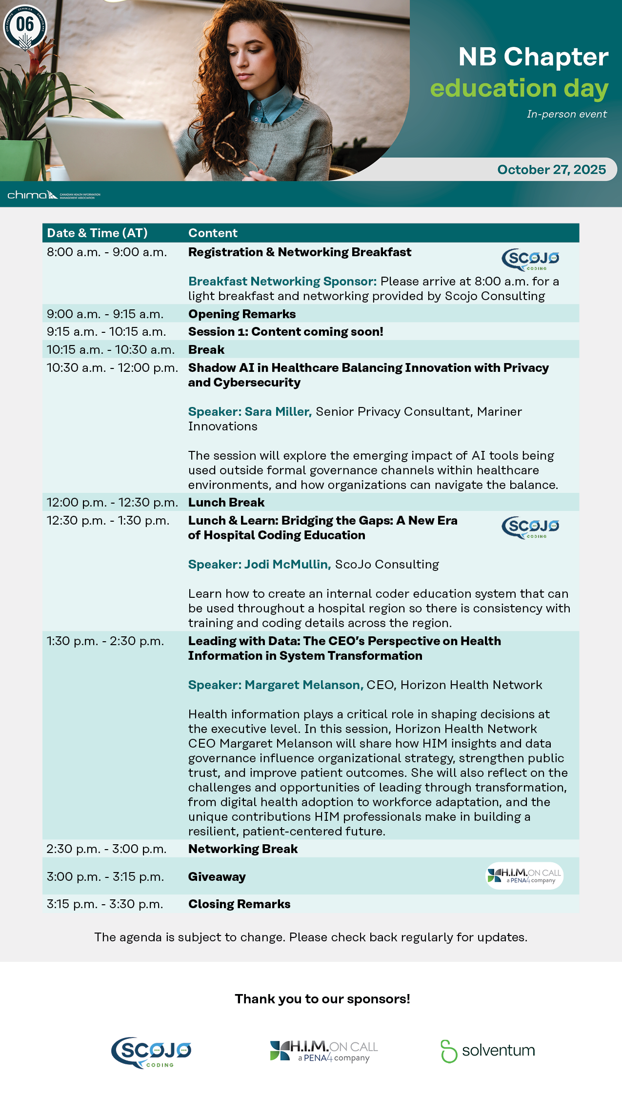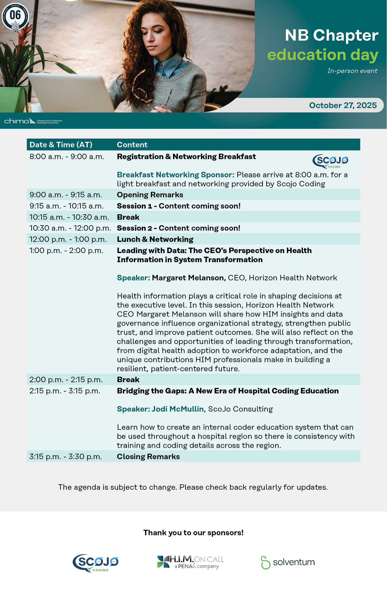 CHIMA professional members can earn 6 CPE credits with the Canadian College of Health Information Management for attending.